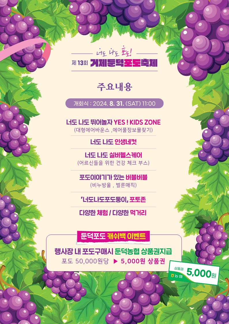 거제 둔덕 포도 축제는 지역의 풍부한 자연과 문화를 체험할 수 있는 특별한 행사입니다. 포도 수확 체험, 다양한 문화 공연, 그리고 맛있는 먹거리를 통해 가족과 함께 소중한 시간을 보낼 수 있습니다. 2024년 8월 31일부터 9월 1일까지, 거제 둔덕 포도 축제에서 여러분을 기다리고 있습니다. 이 축제를 통해 지역 농산물의 소중함을 느끼고, 아름다운 추억을 만들어보세요.