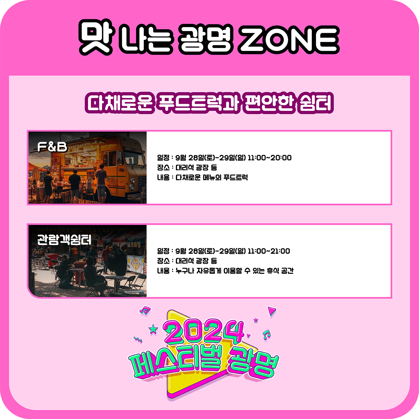 페스티벌 광명은 매년 가을에 열리는 대규모 행사로, 올해는 9월 28일부터 9월 29일까지 진행됩니다. 이 기간 동안 다양한 문화 행사와 체험 프로그램이 마련되어 있어 가족 단위 방문객과 친구들, 연인 모두가 즐길 수 있는 기회를 제공합니다. 특히, 개막식은 9월 28일 저녁 7시에 열리며, 화려한 불꽃놀이와 함께 시작됩니다. 또한, 매일 오후 4시부터 10시까지 다양한 부스와 공연이 열리며, 주말에는 특별 프로그램이 마련되어 더욱 다채로운 즐길 거리가 제공됩니다.