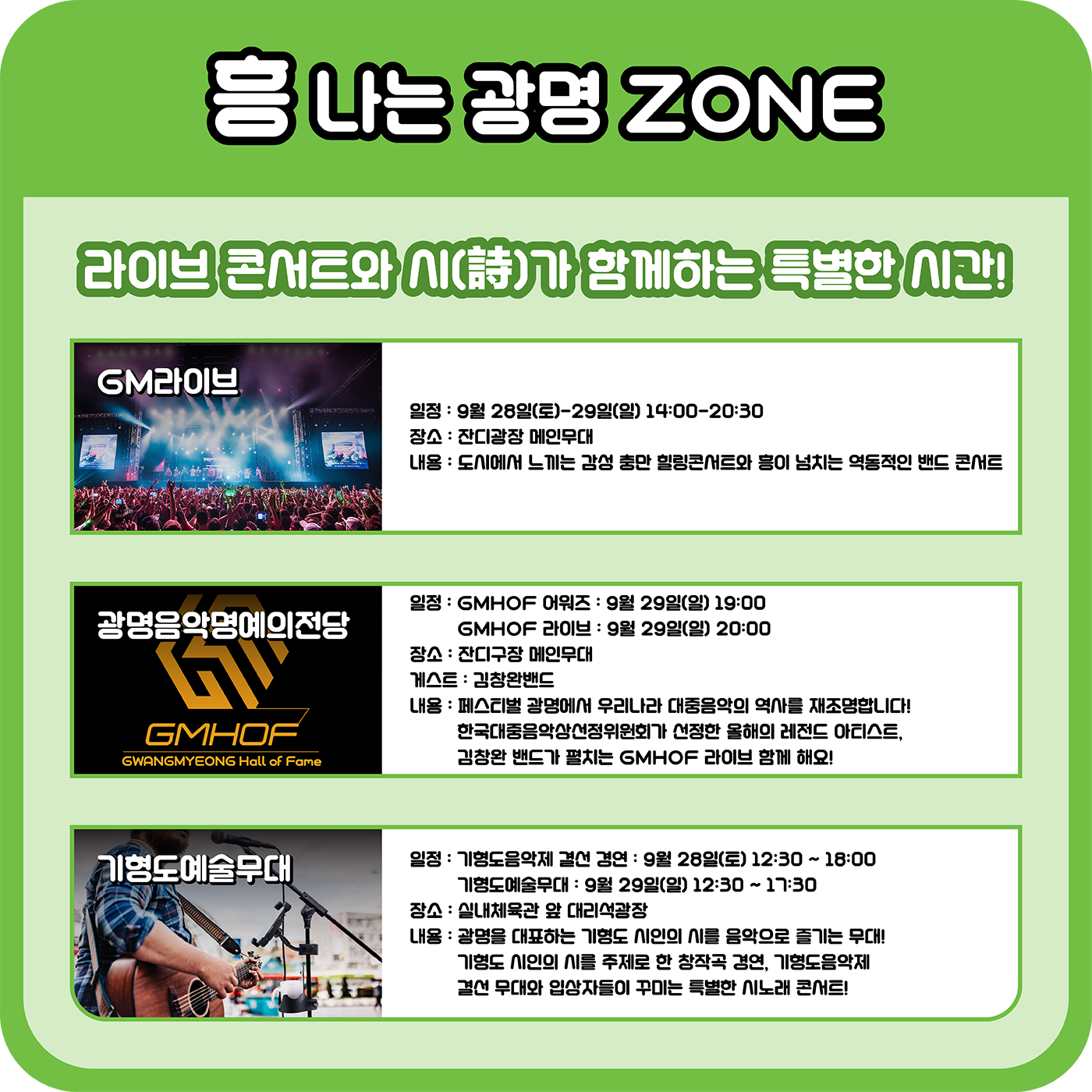 페스티벌 광명에서는 여러 가지 주요 프로그램이 진행됩니다. 그 중에서도 특히 주목할 만한 몇 가지를 소개합니다.