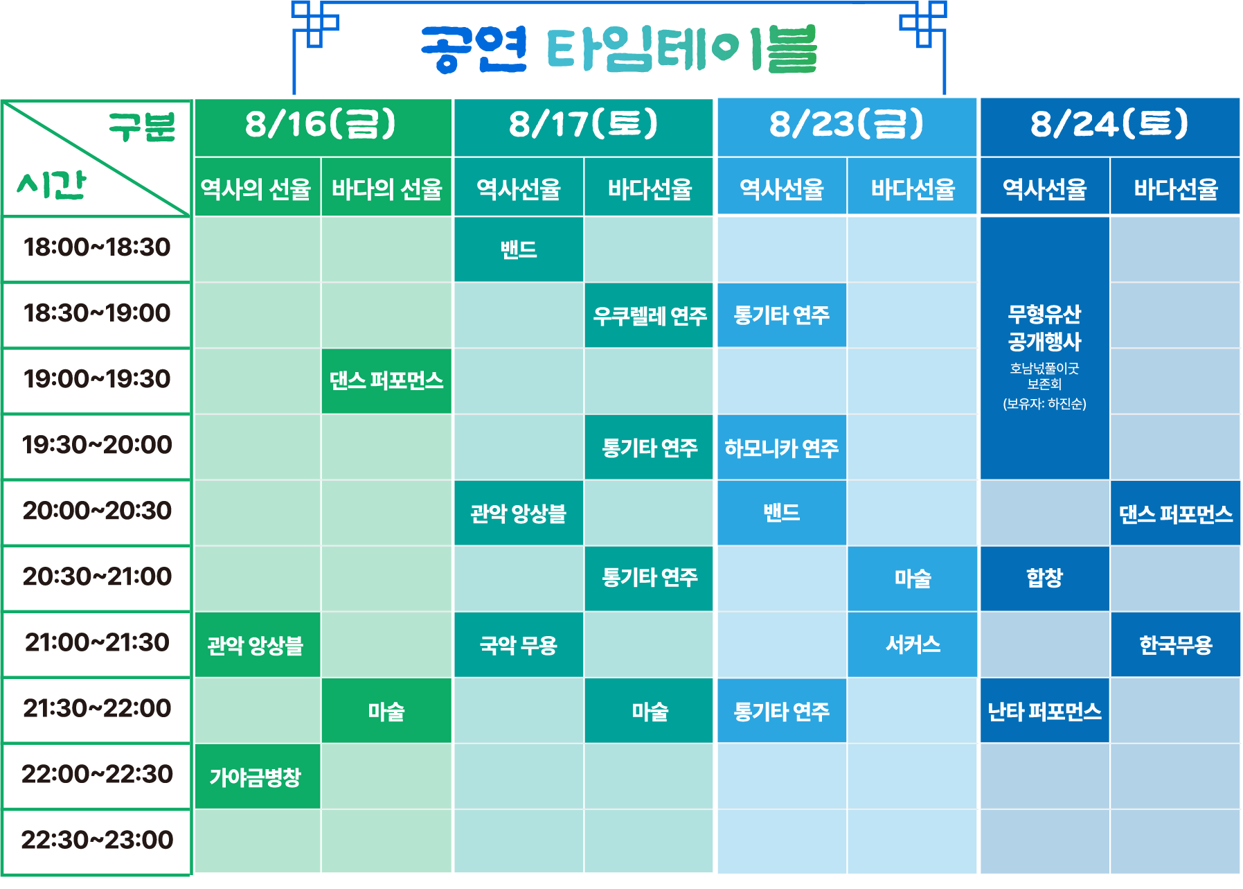매일 저녁, 군산의 전통 문화를 체험할 수 있는 공연이 진행됩니다. 판소리, 탈춤, 전통 무용 등 다양한 공연이 펼쳐지며, 관객들은 공연 후 직접 참여할 수 있는 체험 프로그램도 마련되어 있습니다. 이를 통해 관람객들은 전통 문화를 더욱 가까이에서 느낄 수 있는 기회를 갖게 됩니다.
