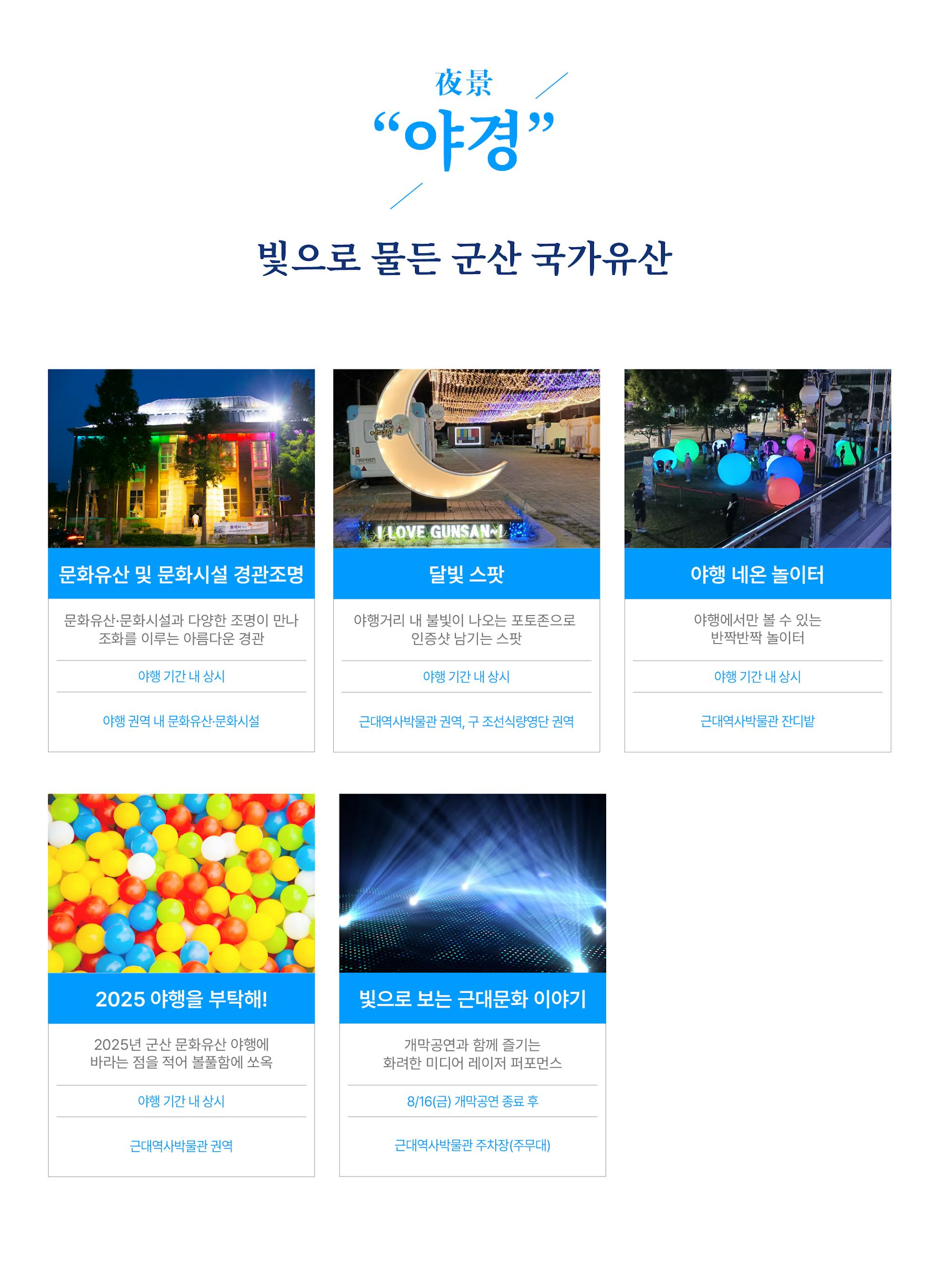 군산문화유산야 행사는 오는 1차 8월 16일부터 8월 17일, 2차 8월 23일부터 24일까지 진행됩니다. 매일 저녁 6시부터 시작하여 11시까지 진행되며, 다양한 프로그램이 시간대별로 마련되어 있습니다. 특히, 이번 행사에서는 저녁 시간에 맞춰 다채로운 공연과 전시가 함께 진행되어 더욱 풍성한 경험을 제공합니다.