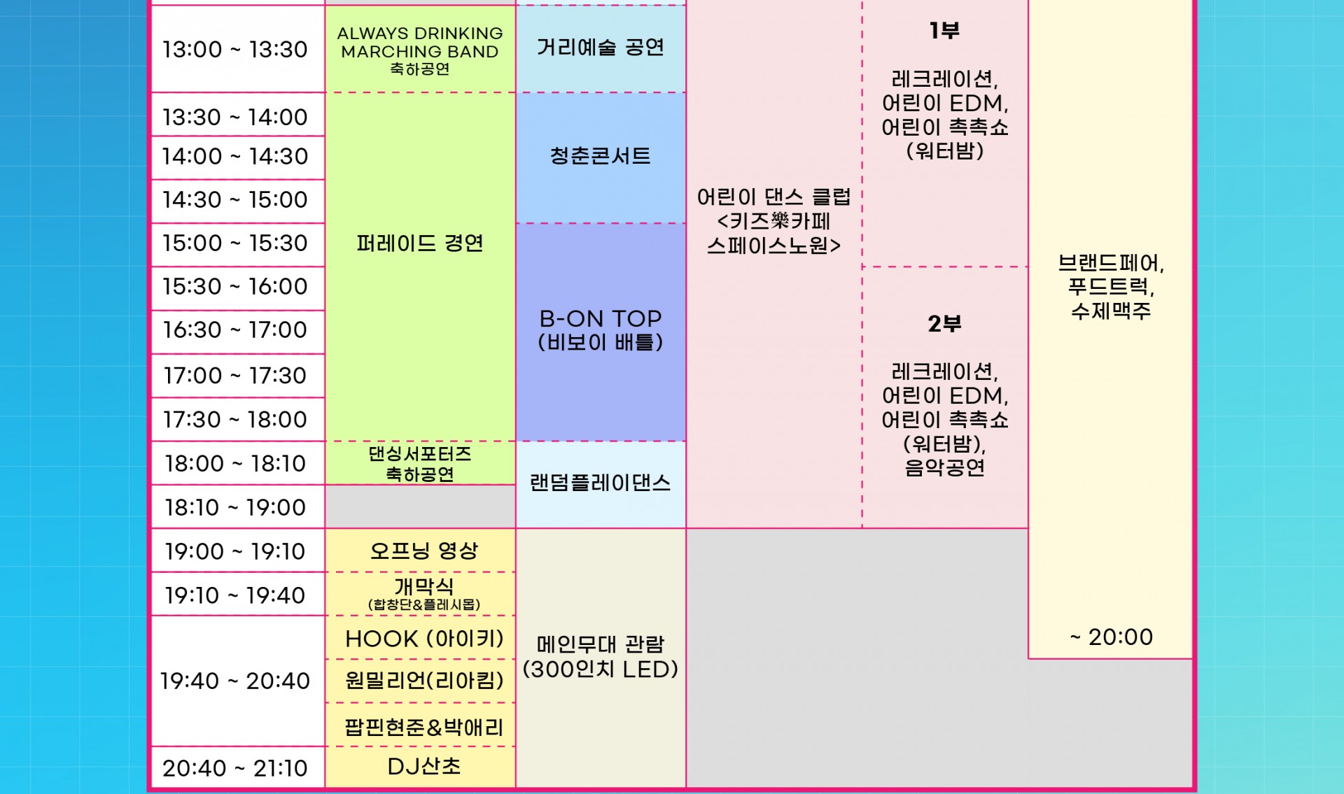 페스티벌 기간 동안 다양한 워크숍과 체험 프로그램도 진행됩니다. 어린이부터 성인까지 참여할 수 있는 프로그램들이 마련되어 있어, 가족 단위 방문객들에게도 인기가 많습니다. 댄스, 음악, 미술 등 다양한 분야의 전문가들이 직접 지도하는 워크숍을 통해, 참여자들은 새로운 취미를 발견하고, 창의력을 발휘할 수 있는 기회를 가질 수 있습니다.