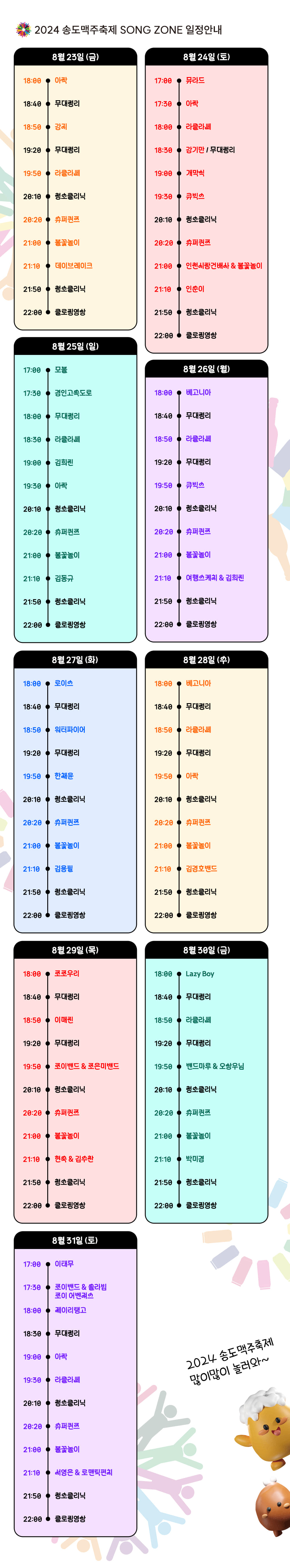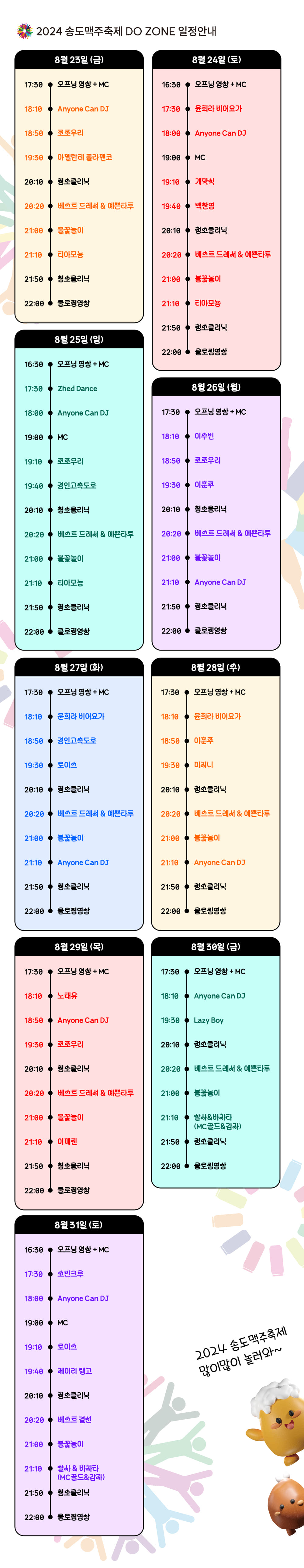 축제 기간 동안 각종 이벤트와 공연이 이어지며, 매일 다른 주제로 진행되는 프로그램들이 준비되어 있습니다. 특히, 개막일인 8월 15일에는 축제의 시작을 알리는 화려한 개막식이 진행되며, 방문객들의 많은 관심을 모을 것으로 예상됩니다.