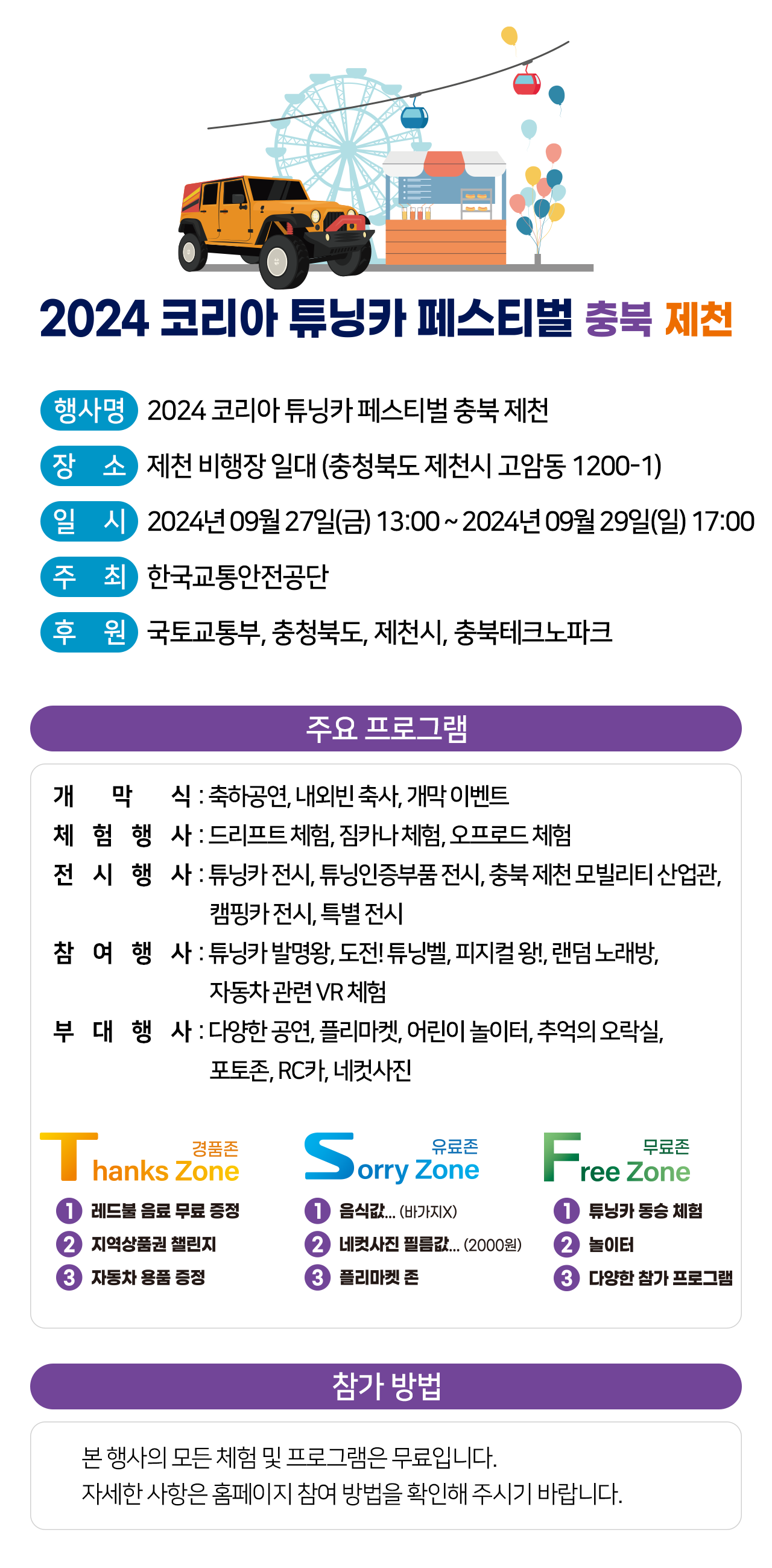 제천 코리아 튜닝카 페스티벌은 2024년 9월 27일부터 9월 29일까지 개최됩니다. 행사 장소는 제천의 아름다운 자연 속에서 열리는 제천 종합운동장입니다. 이곳은 접근성이 용이하고 넓은 공간 덕분에 많은 관람객과 참가자들이 편안하게 즐길 수 있는 환경을 제공합니다. 축제는 3일 동안 진행되며, 각 날마다 특색 있는 프로그램이 마련되어 있습니다.