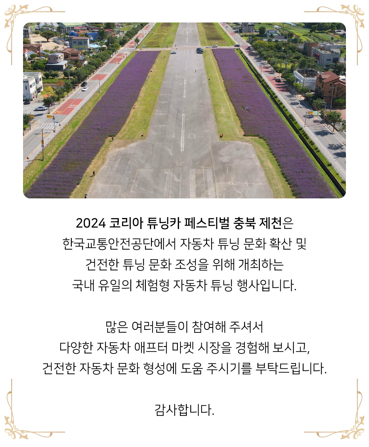 제천 코리아 튜닝카 페스티벌은 자동차 애호가들에게 잊지 못할 경험을 선사하는 축제입니다. 다양한 프로그램과 이벤트가 마련되어 있어 누구나 즐길 수 있는 환경을 제공합니다. 2024년 9월, 제천에서 열리는 이 특별한 축제에 꼭 참여하여 자동차의 매력을 만끽해 보시기 바랍니다. 자동차와 함께하는 이 즐거운 여정이 여러분에게 특별한 기억으로 남길 바랍니다.