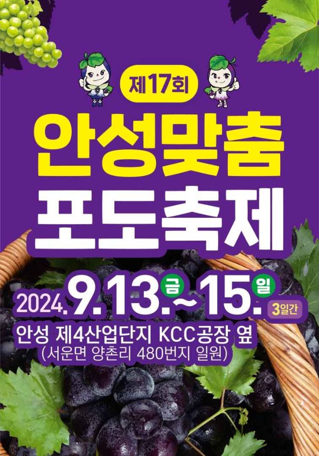 경기도 안성시는 매년 가을, 포도의 계절이 돌아오면 안성맞춤포도축제를 개최합니다. 올해 축제는 2024년 9월 13일부터 9월 15일까지 진행됩니다. 행사 장소는 안성시 제4나업단지 KCC공장 옆으로, 접근성이 뛰어나 많은 관람객들이 방문할 것으로 예상됩니다. 축제 기간 동안 다양한 프로그램이 마련되어 있어 가족 단위 방문객들에게도 적합합니다. 안성맞춤포도축제는 매년 많은 관광객을 유치하며, 지역 농산물의 소비 촉진과 지역 경제 활성화를 목표로 하고 있습니다. 포도의 수확 시즌에 맞춰 열리는 만큼, 신선하고 맛있는 포도를 직접 맛볼 수 있는 기회가 제공됩니다.