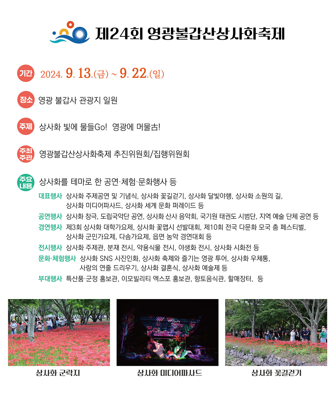 전라남도 영광에서 매년 열리는 불갑산상사화축제는 지역의 문화와 자연을 체험할 수 있는 특별한 기회입니다. 이 축제는 상사화라는 꽃을 주제로 하여, 지역 주민과 관광객이 함께 어우러지는 장이 열립니다. 올해 축제의 일정과 주요 프로그램을 살펴보겠습니다.