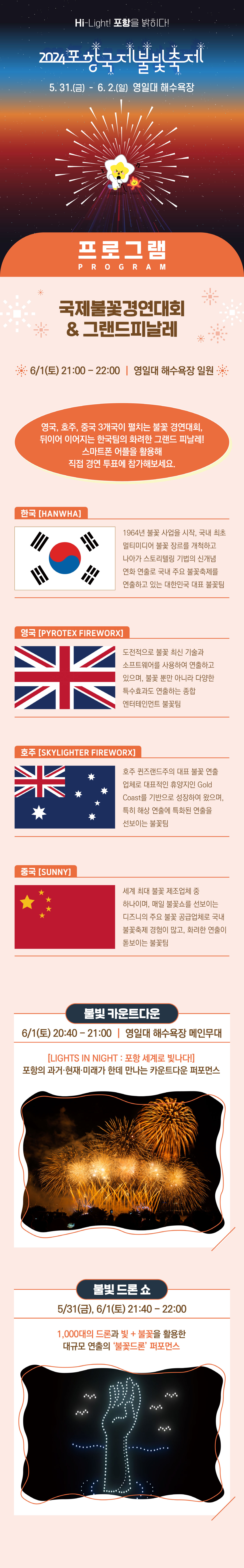 이 축제는 '불과 빛의 도시' 포항의 정체성을 잘 보여주는 행사로, 국내외 유명 불꽃팀이 참가하는 국제불꽃쇼와 불빛 드론쇼, 국제 불꽃 경연대회, 거리 퍼레이드 등 다양한 프로그램이 펼쳐집니다.